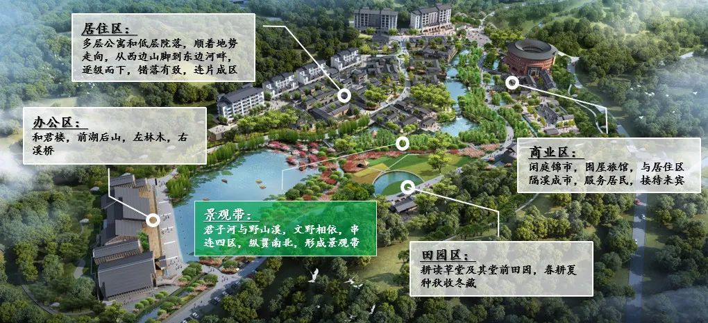 和君小镇以教育为本,依托和君集团的实力和品牌影响力,建设和君集团的总部基地,建设和君职业学院及和君商学院的实体校园,以及配套的幼儿园、小学和中学,相应的红色教育、自然教育和营地教育基地,最终建设成为“中国好教育”的小镇形态和示范基地。