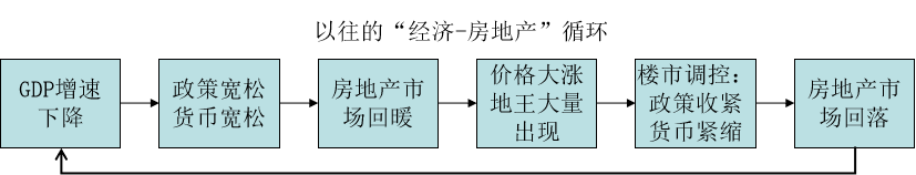 过往房地产起着重要的拉动经济增长的作用,当经济增长面临压力的时候,国家对房地产调控放松,通过房地产市场繁荣来推动经济增长,呈现出“经济—房地产”之间的反复循环,如下图所示: