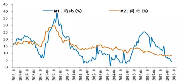 ●资金驱动:此阶段房地产有两轮大行情,分别为2009年与2016年,背后最重要的驱动要素为资金,从下图的M1、M2数据图中可以很容易看出来。