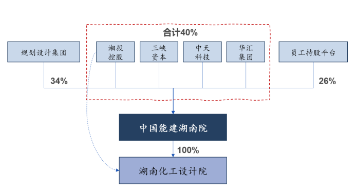 2020年4月,中国能建湖南电力设计院完成混改,其股东中国能源建设集团规划设计有限公司持股比例由100%降至34%;引入四家外部战略投资者湘投控股、三峡资本、中天科技、华汇集团,合计持股比例为40%;杭州湘能建(员工持股企业)持股比例为26%。战略投资者湘投集团将子公司湖南化工设计院作价入股中国能建湖南电力设计院,混改完成后,湖南化工设计院成为中国能建湖南电力设计院的全资子公司。