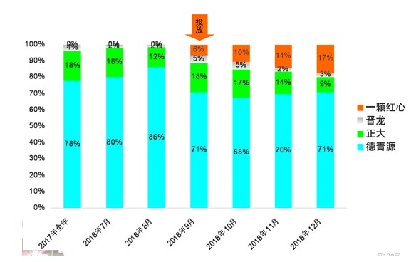 四个月的市场投放期结束后,“一颗红心”抵住了双寡头德青源鸡蛋和正大鸡蛋陈列位、促销员、折价等针对性竞争,截止2018年12月底,超越了排在第二位的正大鸡蛋,勇夺B卖场全系统高端鸡蛋(≥1.0元/个)17%的金额市场份额(Value Share);占据中高端鸡蛋第二的位置[1](见下图)