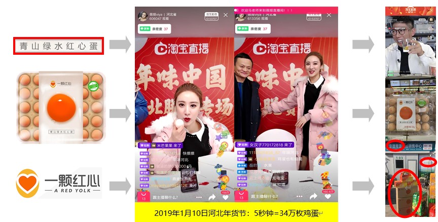 成功聚焦样板市场后,“一颗红心”鸡蛋以样板城市为担保和背书,以点带面,进入更多渠道、更大区域,更广市场。线下卖得好的产品,线上一样自带流量。“一颗红心”在线下销售四个月持续增长、销售如火如荼的同时。渐渐从“线下渠道”扩展到“线上网红直播带货、明星直播带货”。到了2019年1月10日,在淘宝河北年货节中,携手淘宝带货第一网红薇娅,马云老师直播间出镜5秒钟,成交34万枚。