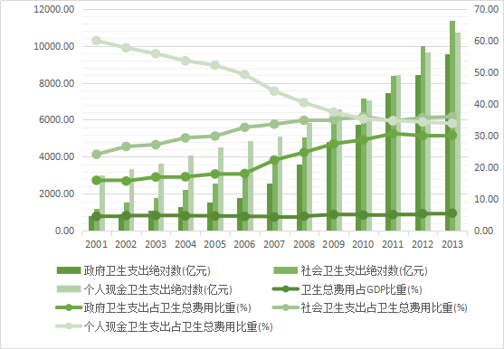 我国卫生总费用占GDP的比重从2001年的4.58%到2013年的5.57%。从总量上看,虽然我国政府卫生支出、社会卫生支出和个人卫生支出的绝对数均在持续增加,但社会卫生支出绝对数在2010年开始超过个人卫生支出绝对额,政府卫生支出绝对量始终低于社会卫生支出和个人卫生支出绝对量。