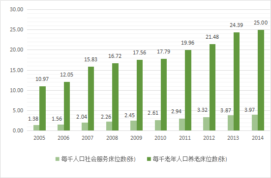 自从2005年以来,我国提供住宿的社会服务机构床位数迅速增加,从2005年的180.7万增长到2014年的540.1万(如图3.3.所示),老年及残疾人床位数由158.1万增长到506.2万,增长超过3倍。而每千个老年人口养老床位数则由10.97张增长到25张,增幅比例超过130%(如图3.4所示)。