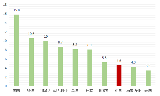 图3.8 世界各国人均医疗保健支出占GDP对比(单位:%)
