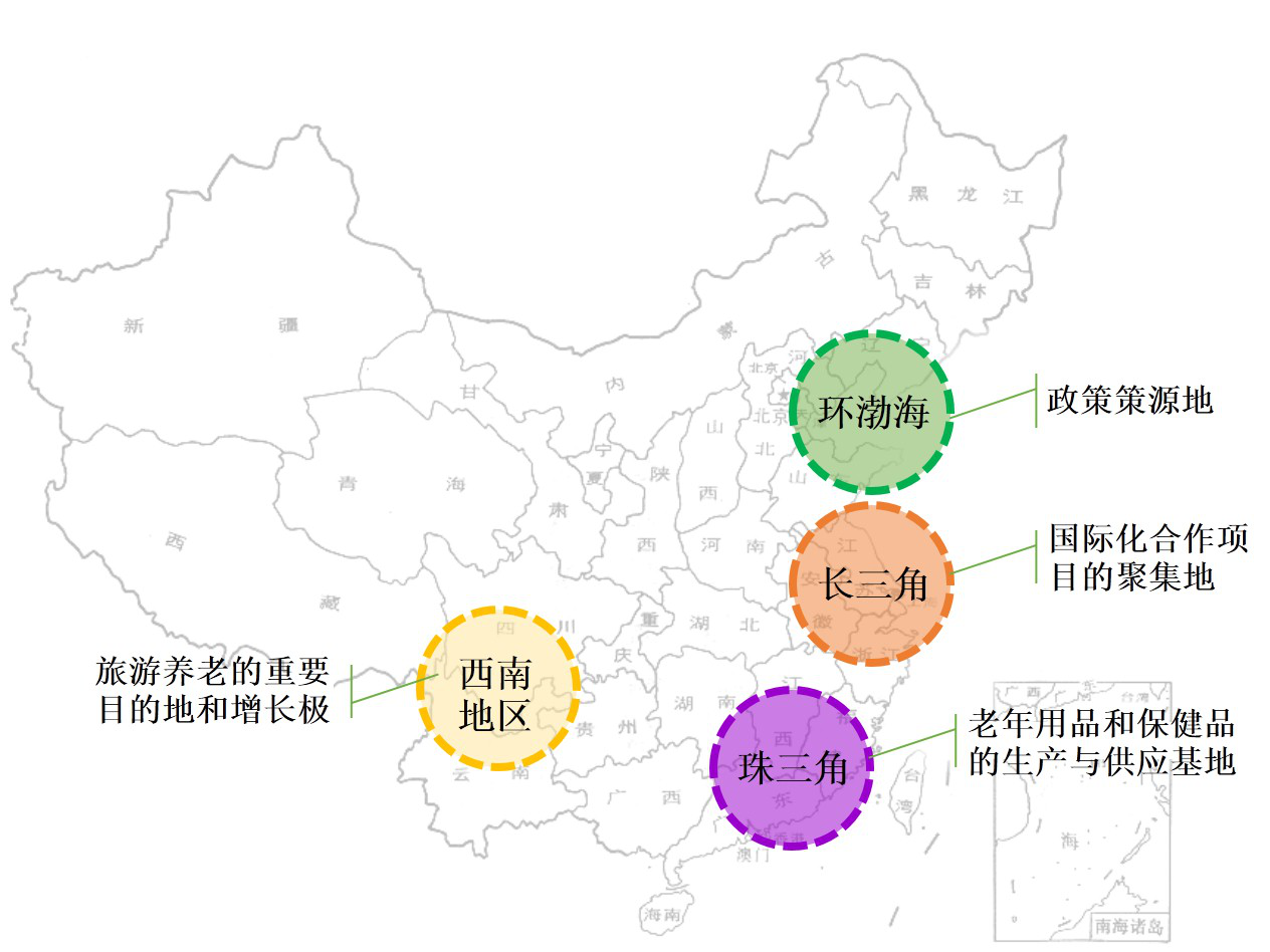 目前,我国养老产业的地区发展主要围绕“环渤海”、“长三角”、“珠三角”和“西南”四大集聚地,四大集聚地特色各异(如图3.12所示)。