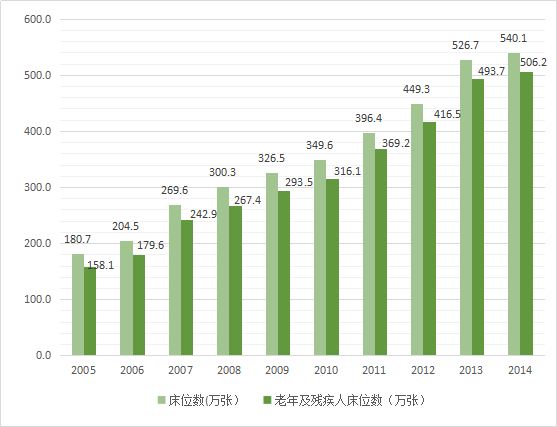 根据我国民政部官方数据,截至2015年3月底,全国各类注册登记的养老服务机构达31833个。机构、社区等养老床位合计达到584.0万张,同比增长19.7%,其中社区留宿和日间照料床位197.3万张,目前,每千名老年人拥有养老床位数达27.5张,同比增长10.0%。