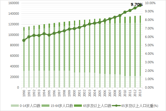 按照国际标准,当60岁以上的人口占总人口比例达到10%,或65岁以上人口占总人口的比重达到7%,即表明该国家或地区进入老龄化社会。基于该标准,中国于2000年进入老龄化社会。截至2013年底,中国65岁以上人口为1.3亿人,占总人口的9.7%(如图3.1所示)。根据我国老龄工作委员会预测,到2020年,中国60岁以上老年人将达到2.4亿,约占全国人口16%,到2050年该比例将达到28%。2050年中国老年人口将达到4.8亿,约占全球老年人口的四分之一,中国将成为世界上老年人口最多的国家。