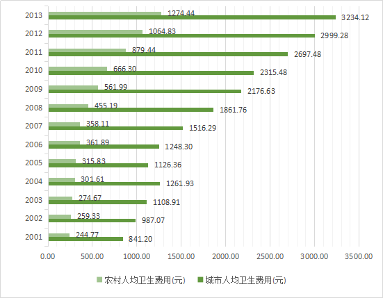 此外,我国人均卫生费用由2001年的393.8元增长到2013年的2327.37元,虽然,城市人均卫生费用的绝对量要高于农村人均卫生费用,然而,农村人均卫生费用的增幅要超过城市(如图3.6所示)。