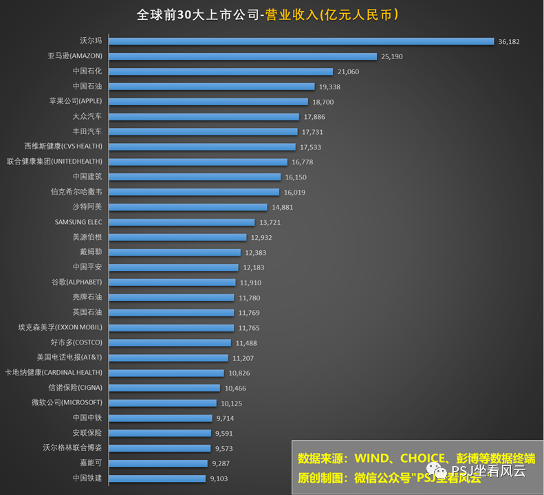 1、美国15家:沃尔玛、亚马逊、苹果、西维斯健康(CVSHEALTH)、联合健康集团(UNITEDHEALTH)、伯克希尔哈撒韦、美源伯根、谷歌、埃克森美孚、好市多(COSTCO)、美国电话电报(AT&T)、卡地纳健康(CARDINALHEALTH)、信诺保险(CIGNA)、微软、沃尔格林联合博姿