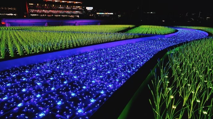 以日本江户极彩棚田为例。江户极彩棚田以江户时代的棚田景观为原型,运用灯光效果,展现了梯田一年四季不同的景观,被称为日本最原始的风景之一。当你换一个角度,站在一个制高点再来看这个四季变换的梯田,就如同真的走进了现实世界,变幻莫测的灯光,营造了一片浪漫的田园风光。