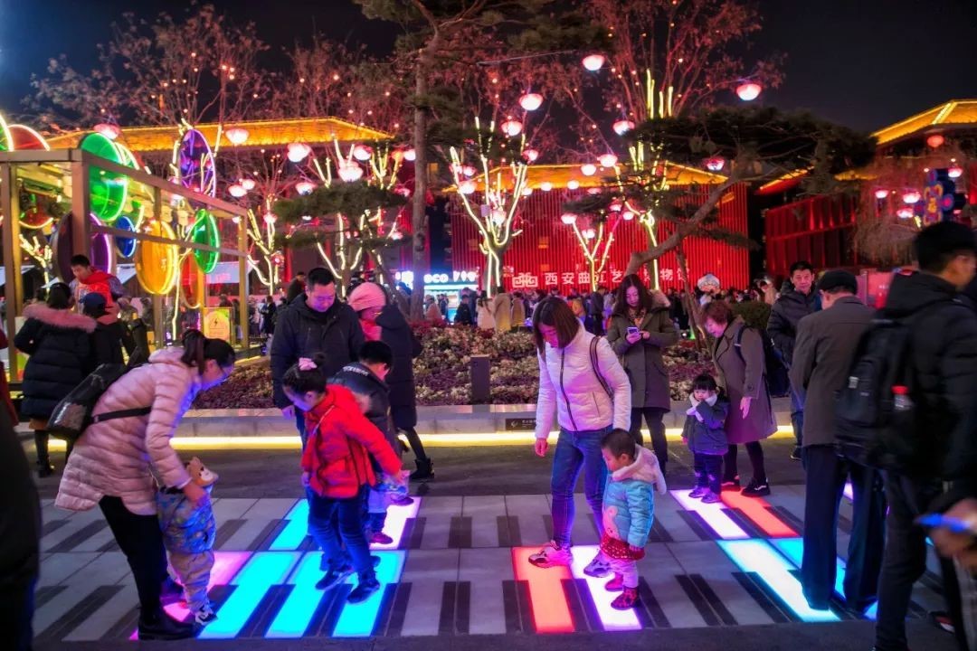 同时,通过声光电的完美结合,充分调动体验者的“五感”,多维度打造沉浸式夜游景观空间。其中,“七彩钢琴路” 和”神奇喊泉”互动体验成为最受游客欢迎的打卡点之一。
