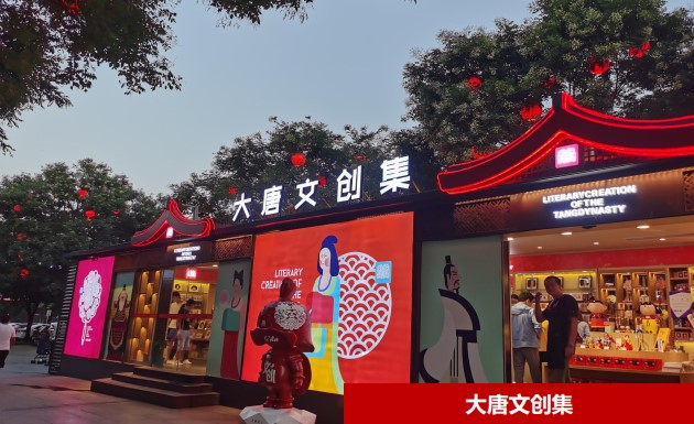 二是文创经营氛围营造。包括特色店铺氛围营造、售卖形式氛围营造、商业场景氛围营造。大唐不夜城开创“大唐制造”品牌,打造文创店铺65家,包含“遇见·Tang”主题文创店2家、特色文创市集30家、 文创花车33组,线上线下全面发展,联动知名品牌(CC卡美联名系列文创),提升文创消费能力。