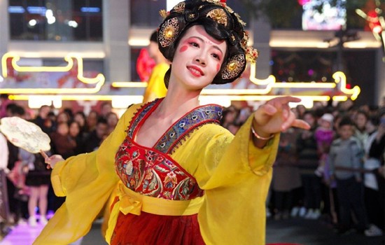 三是网红包装氛围营造。包括特色服装氛围营造、互动性体验、岗位特色化服务设计。此处的“网红”,不仅仅是指网络红人,还包括因关注而走红的人或物,是创造流量的入口。譬如皮卡晨(因扮演不倒翁而走红)、石头哥、上官婉儿、敦煌飞天、悬浮李白等,大唐不夜城生生打造了一个网红集中营。而这些人物参与的带有行为艺术性质的街头表演,因与游客之间的互动交流备受关注,造就了大批的网红打卡点。
