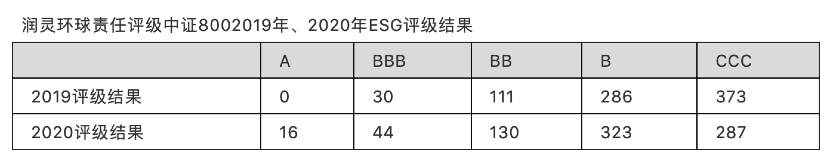 根据国内评级机构润灵环球责任评级(RKS)十二年针对A股上市公司约10,000份CSR报告的信息跟踪分析,和2年对CSI800公司ESG信息的跟踪和评估,显示A股上市公司ESG管理与信息披露尚处洼地,在最新2020评级结果显示:虽评级整体好于2019年,有16家被评为A级,BBB级公司增加47%,BB公司增加17%,B级增加13%,但CCC级公司仍占三分之一之多,A股公司ESG CCC级别占比达到36%。